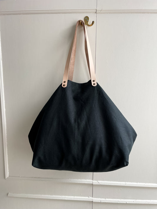MIDI bag: black waxed linen tote bag with leather handles and closure