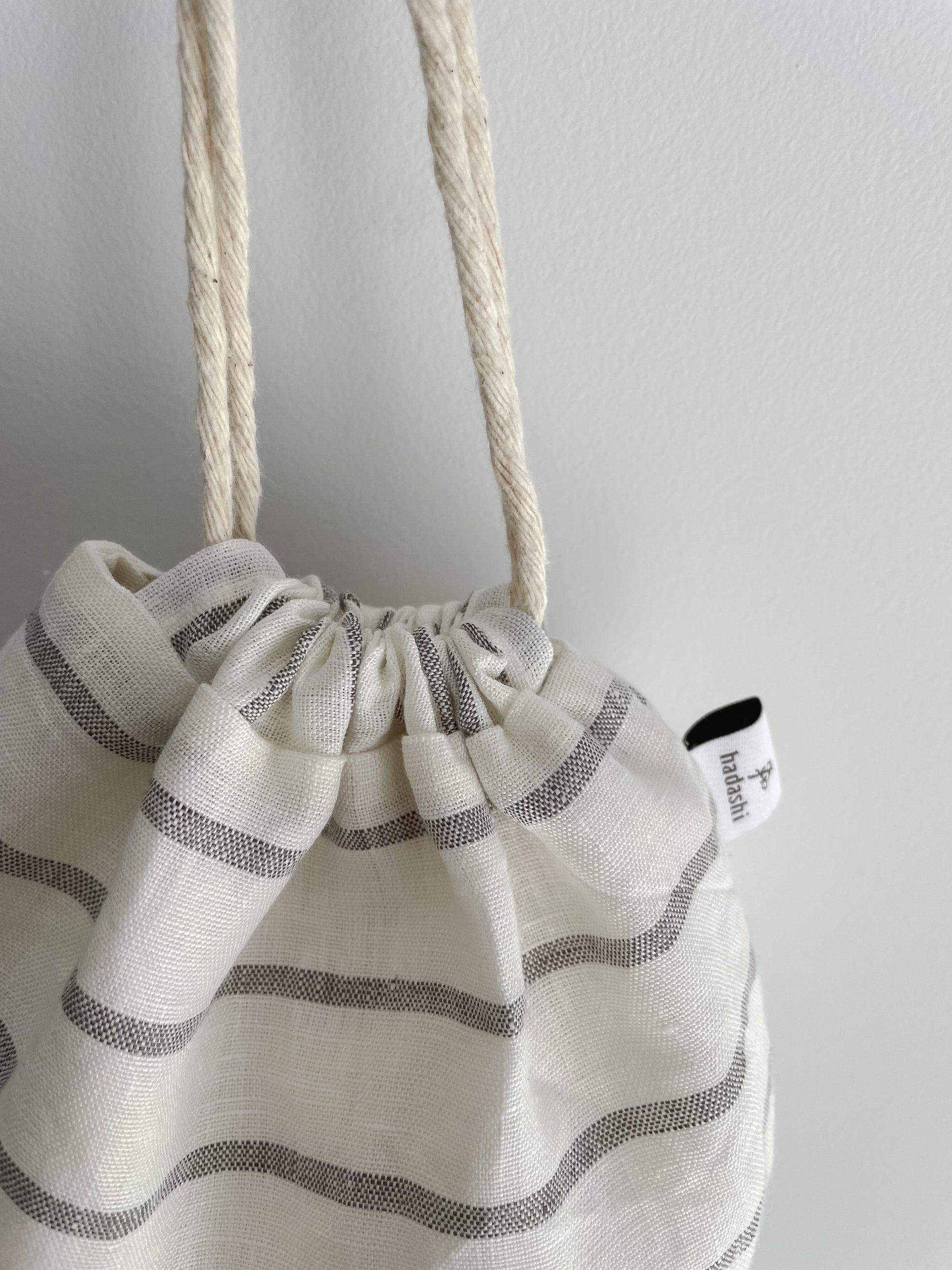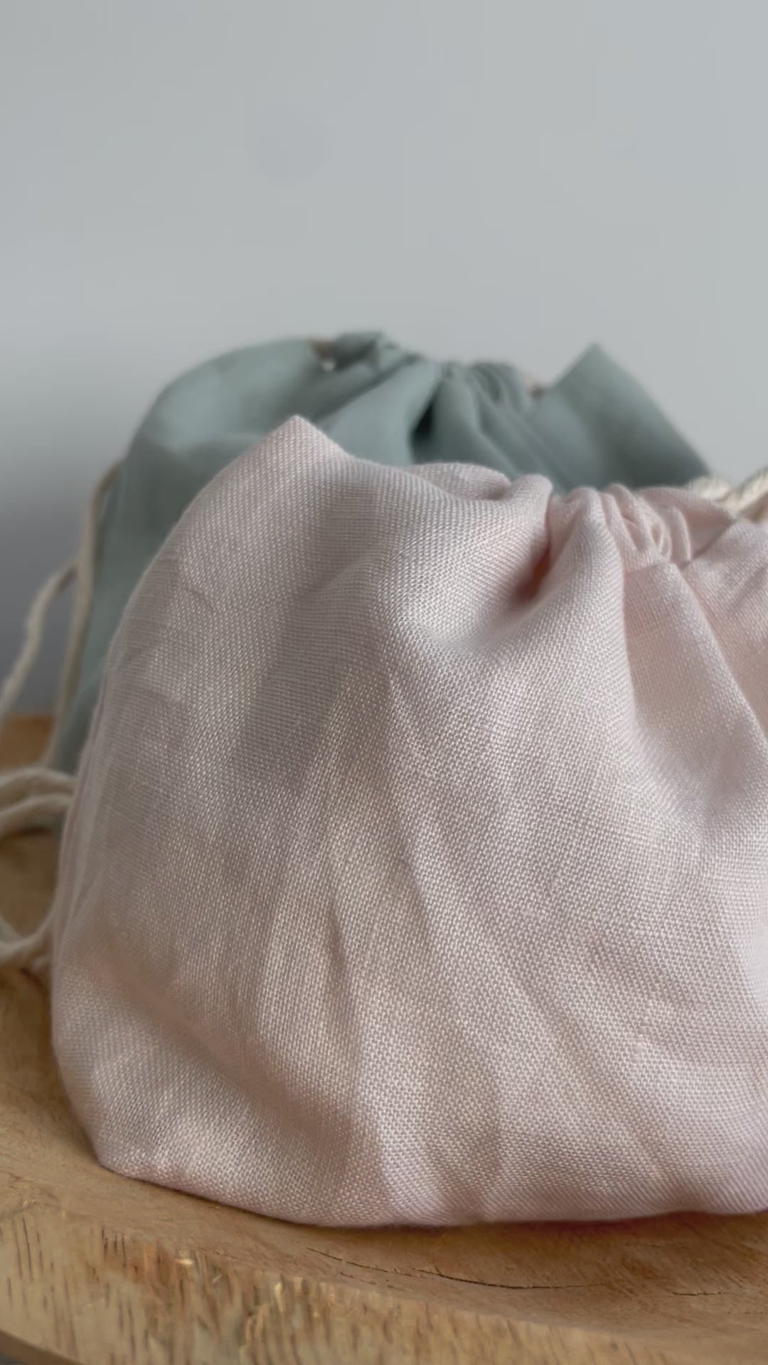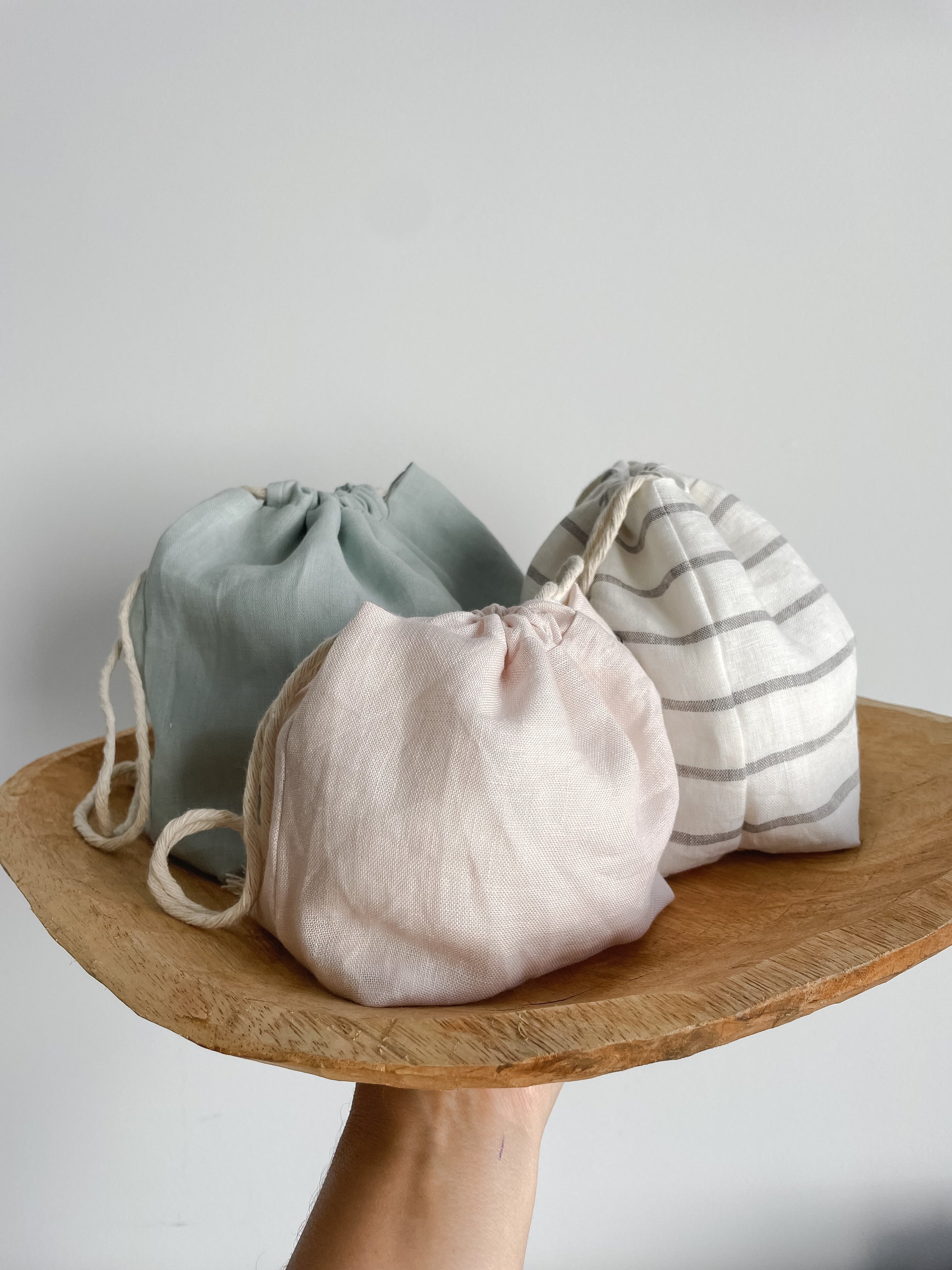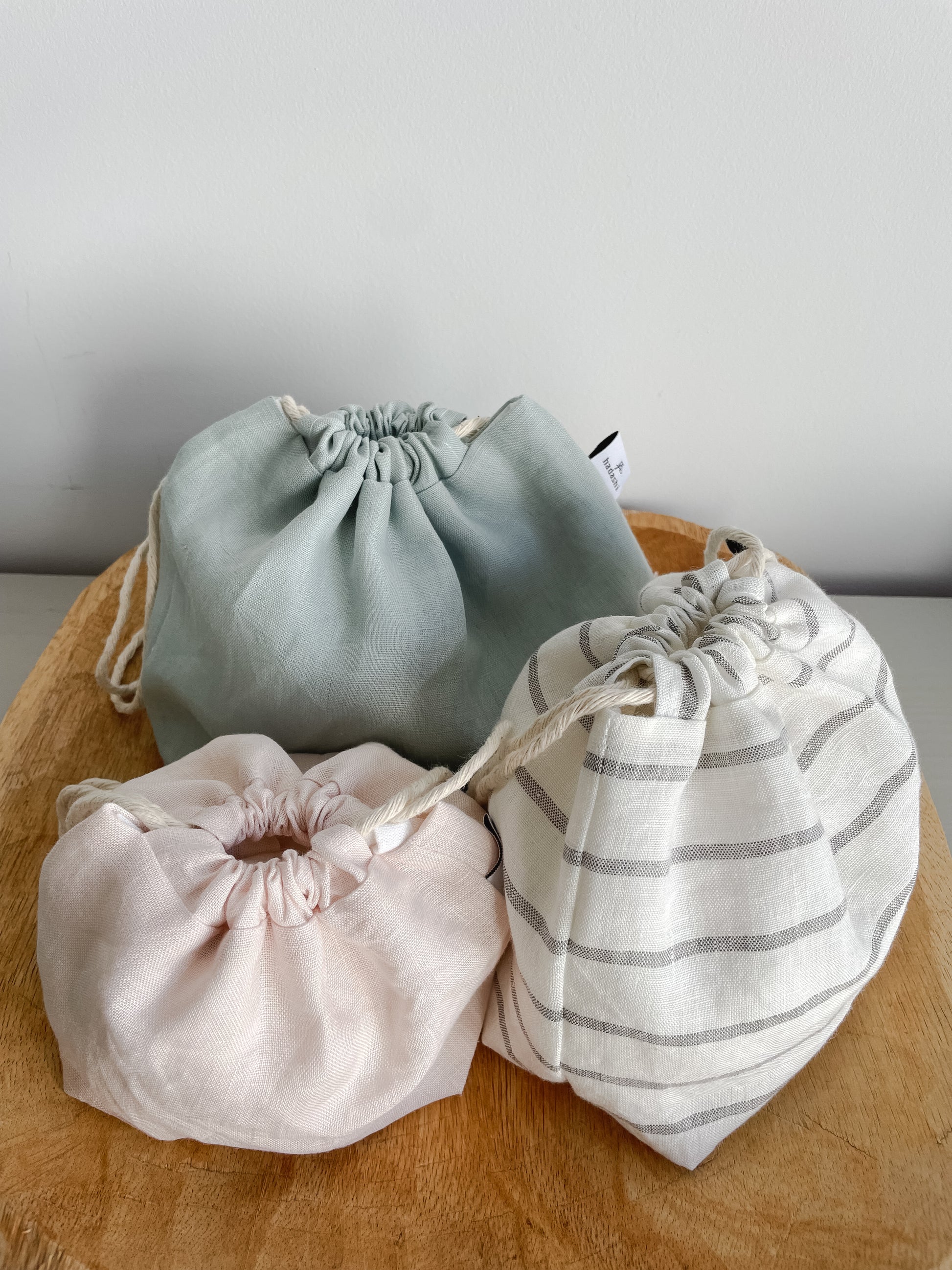 One set includes a small, a medium, and a large drawstring bag. The colors of the set include pink, green, and black stripes. All pouches are lined (with 100% linen or linen-cotton blend).