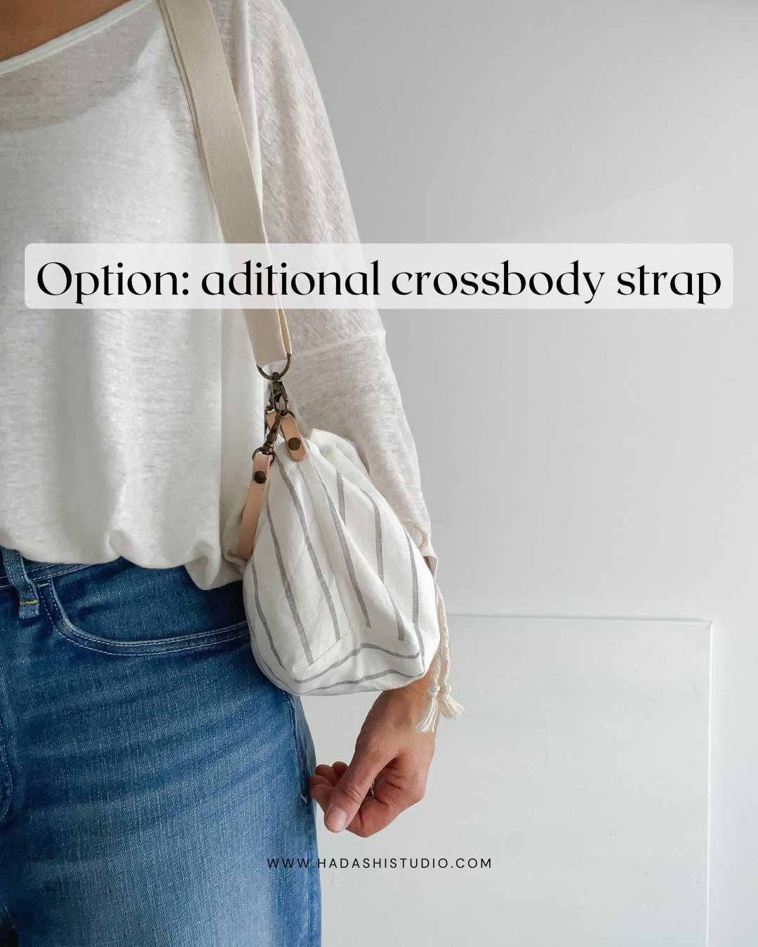 Crossbody strap (optional): 100% cotton webbing with vegetable-tanned leather details and metallic hardware