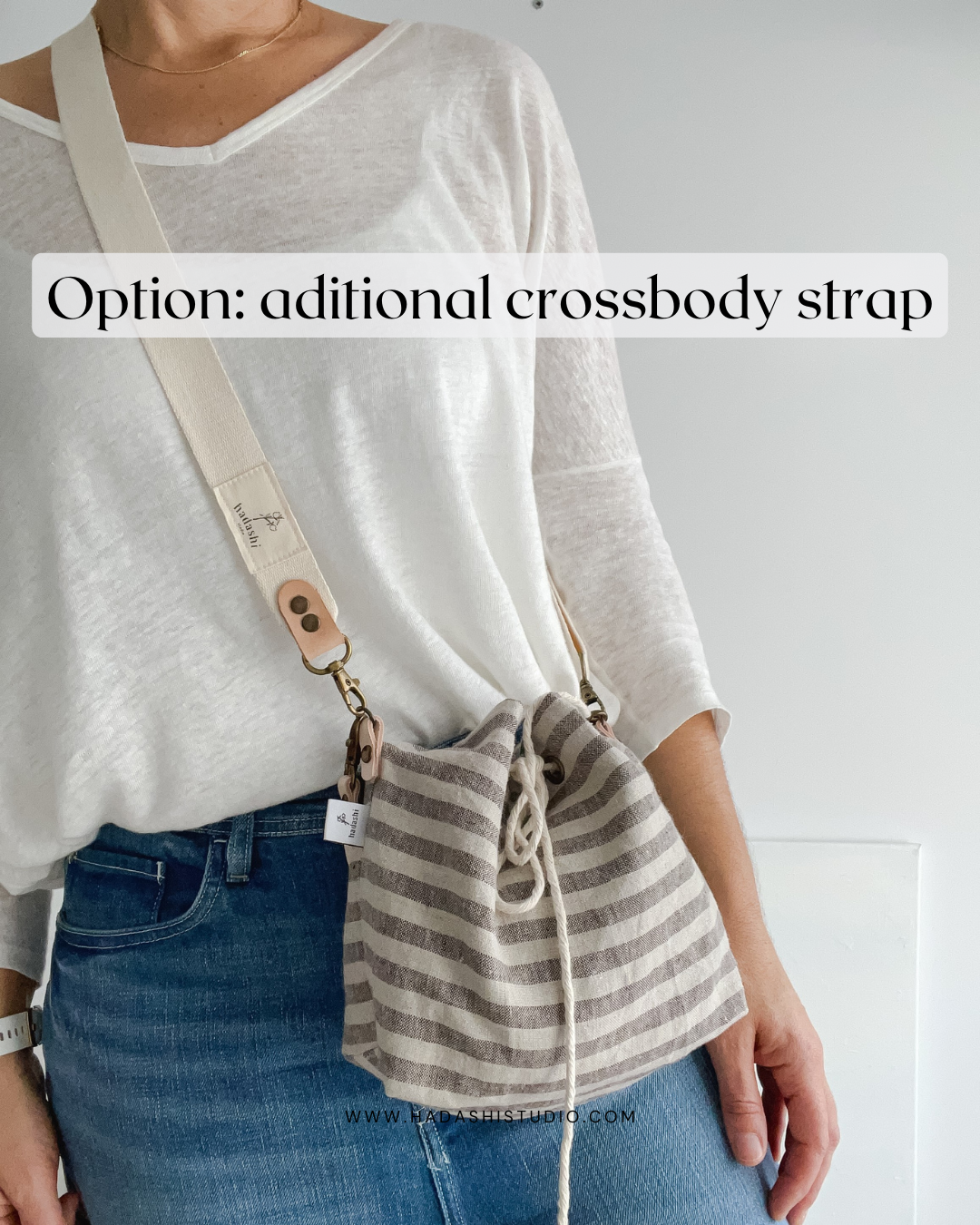 Crossbody strap (optional): 100% cotton webbing with vegetable-tanned leather details and metallic hardware