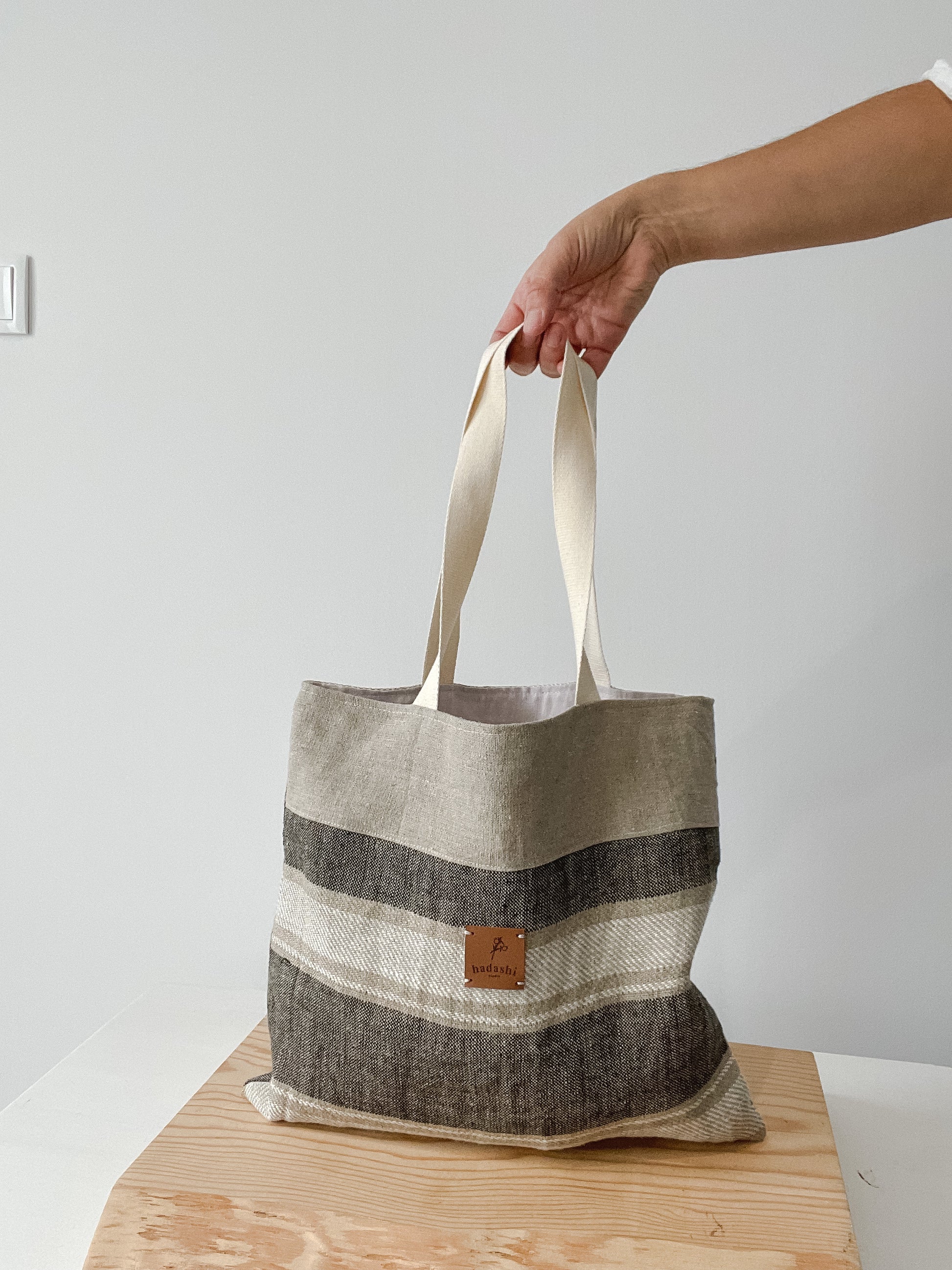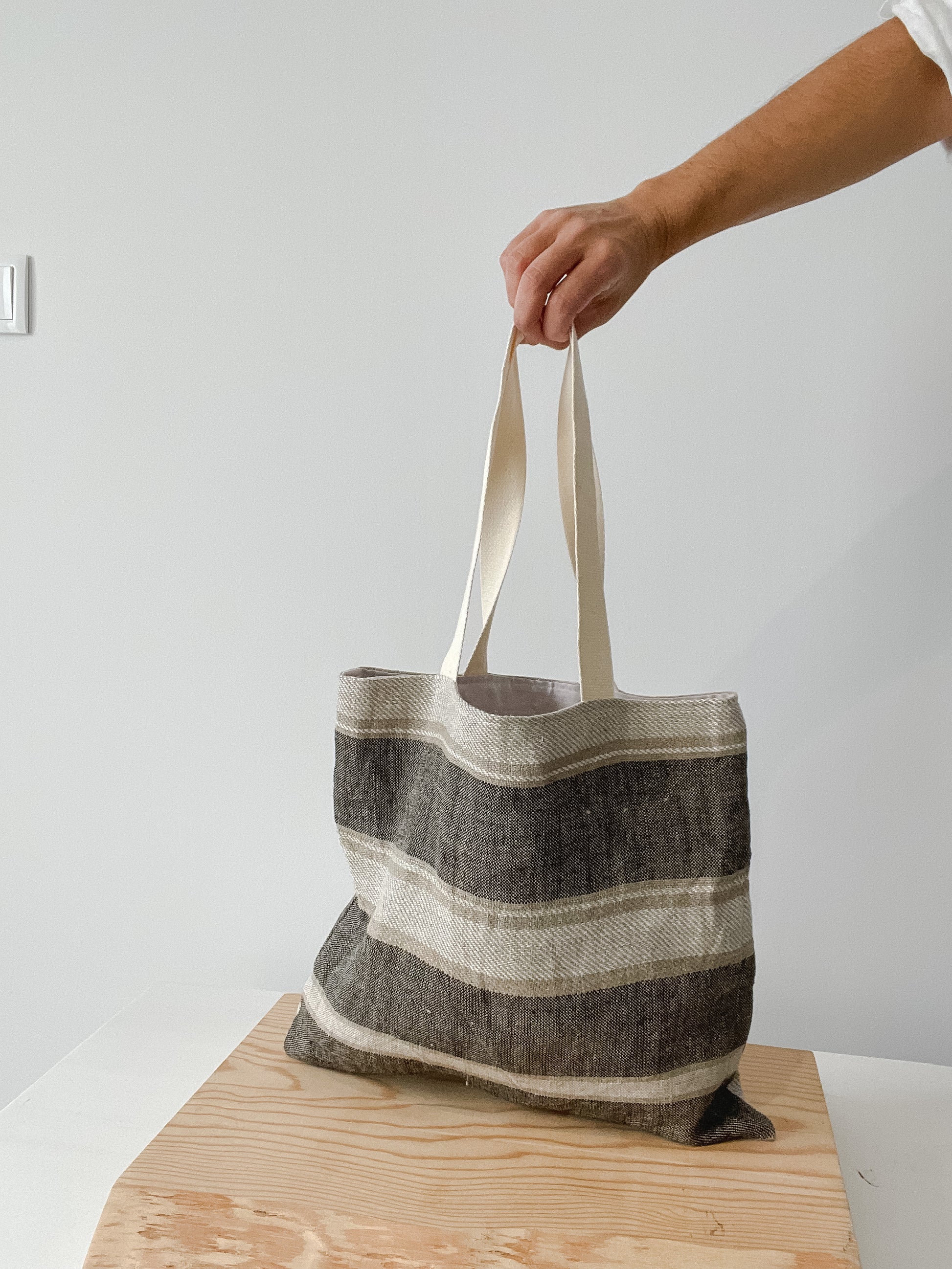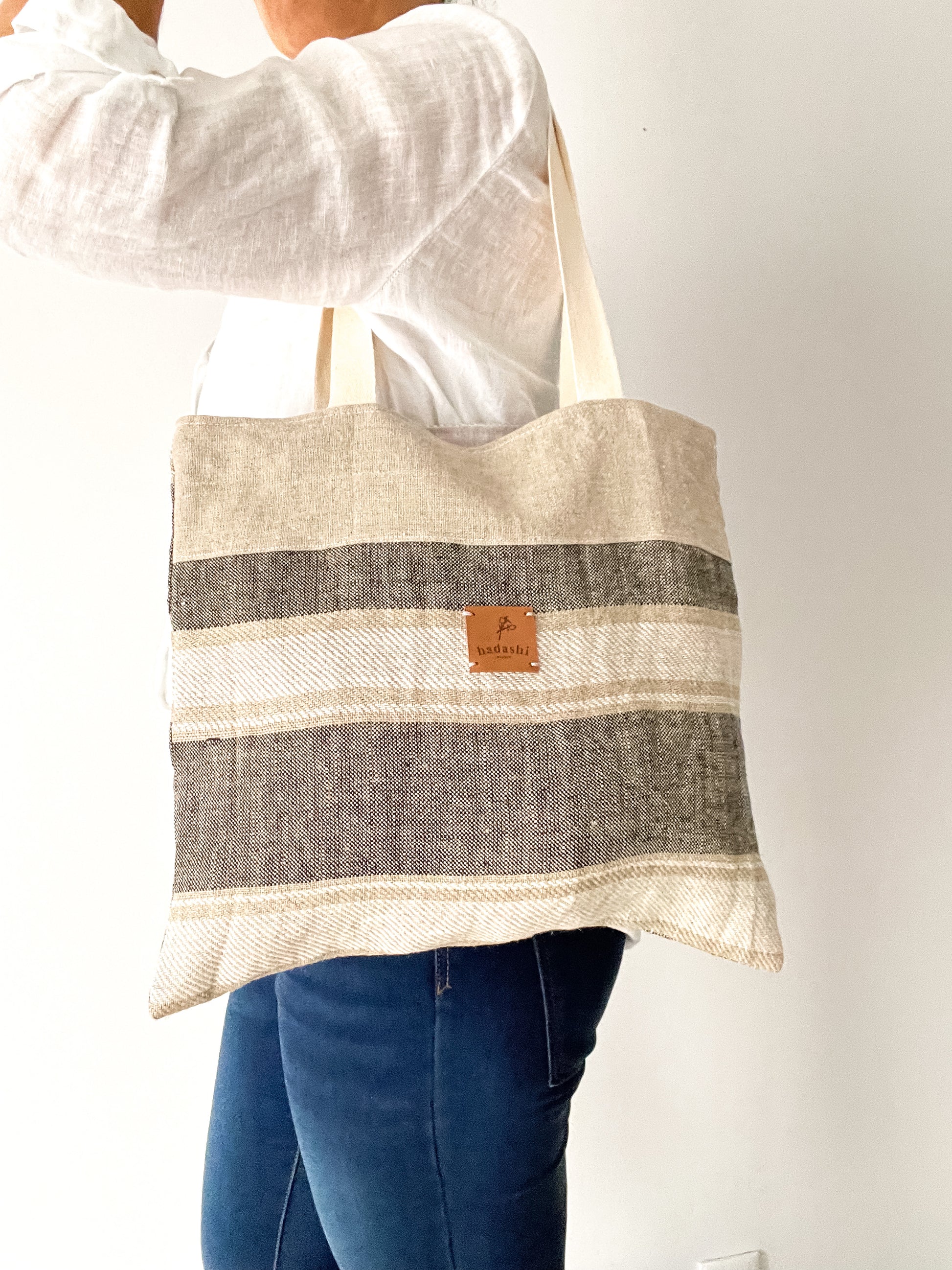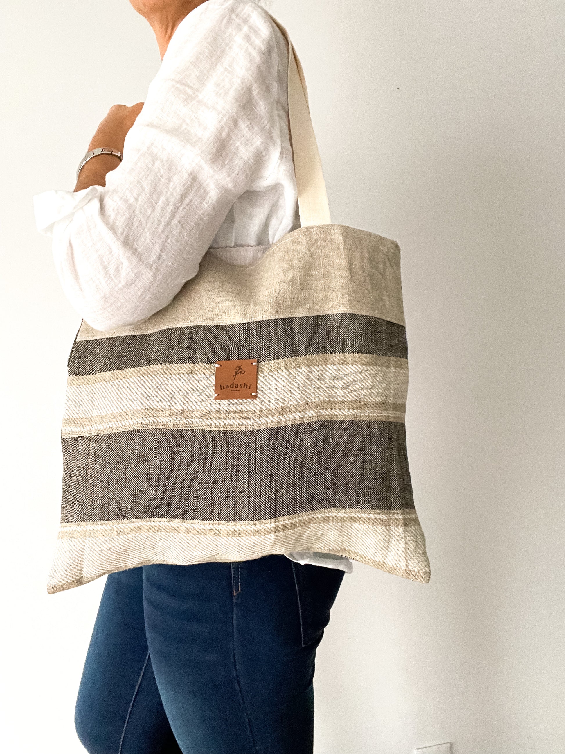 This bag is made of 100% linen in the interior and exterior, so it will age beautifully. The large striped pattern (brown and beige) will go with most of the pieces in your wardrobe. Although casual, it´s super elegant.