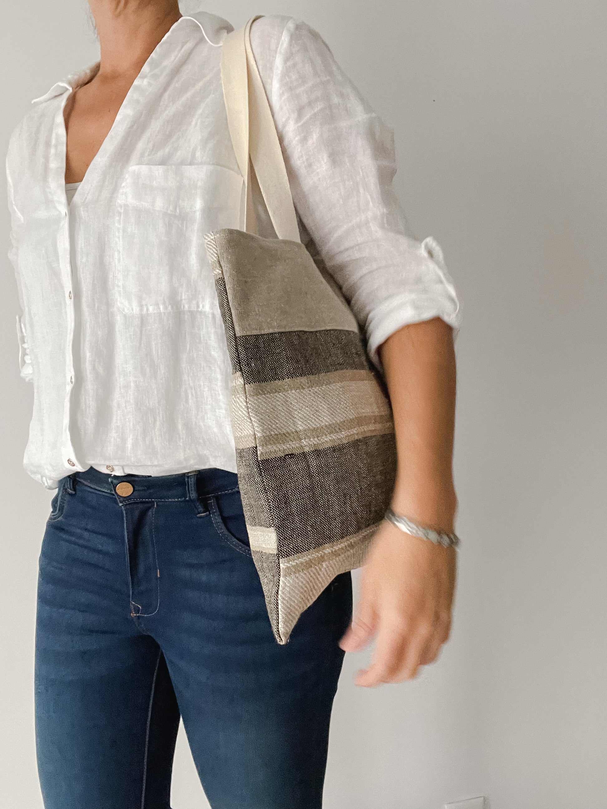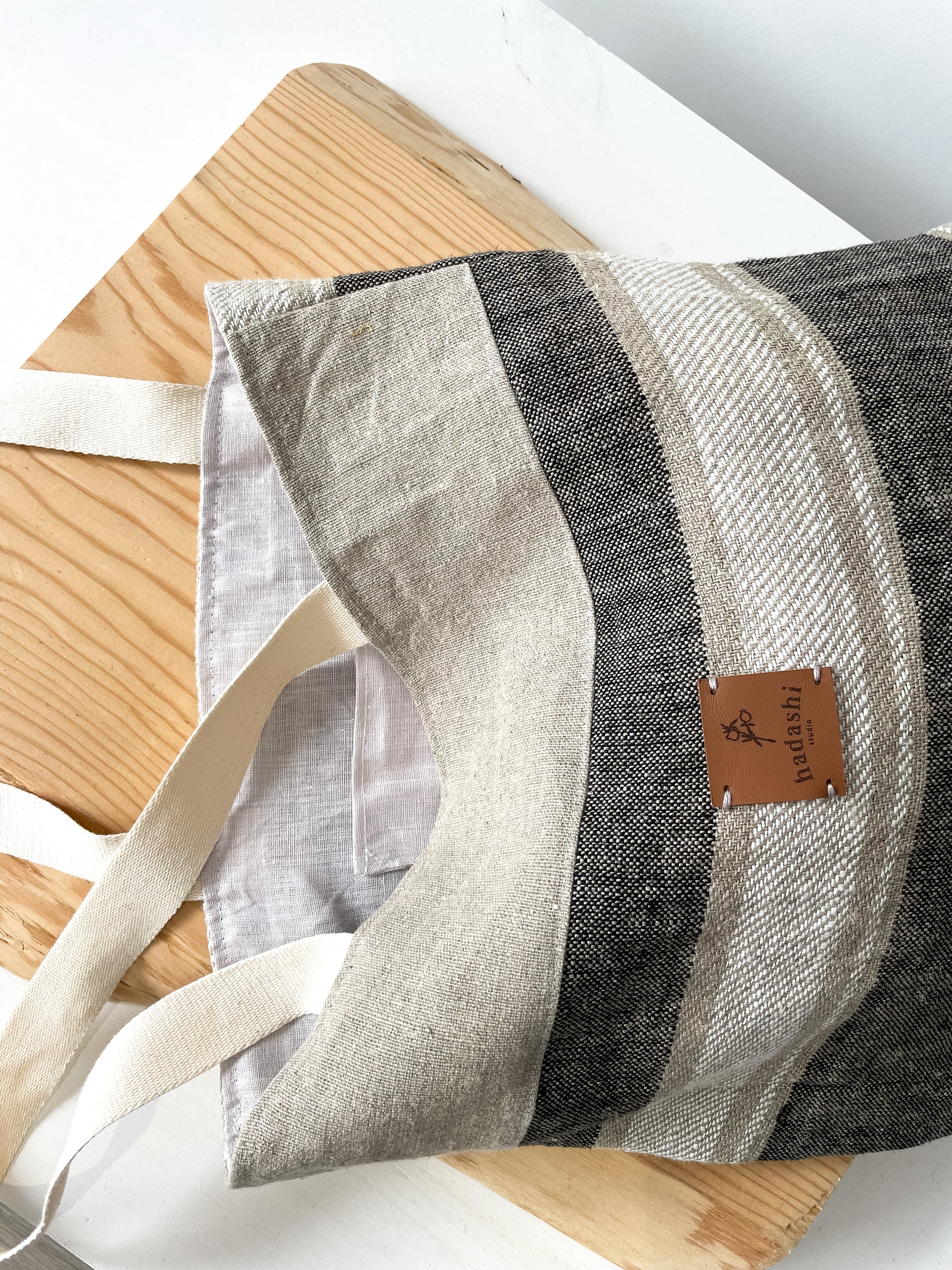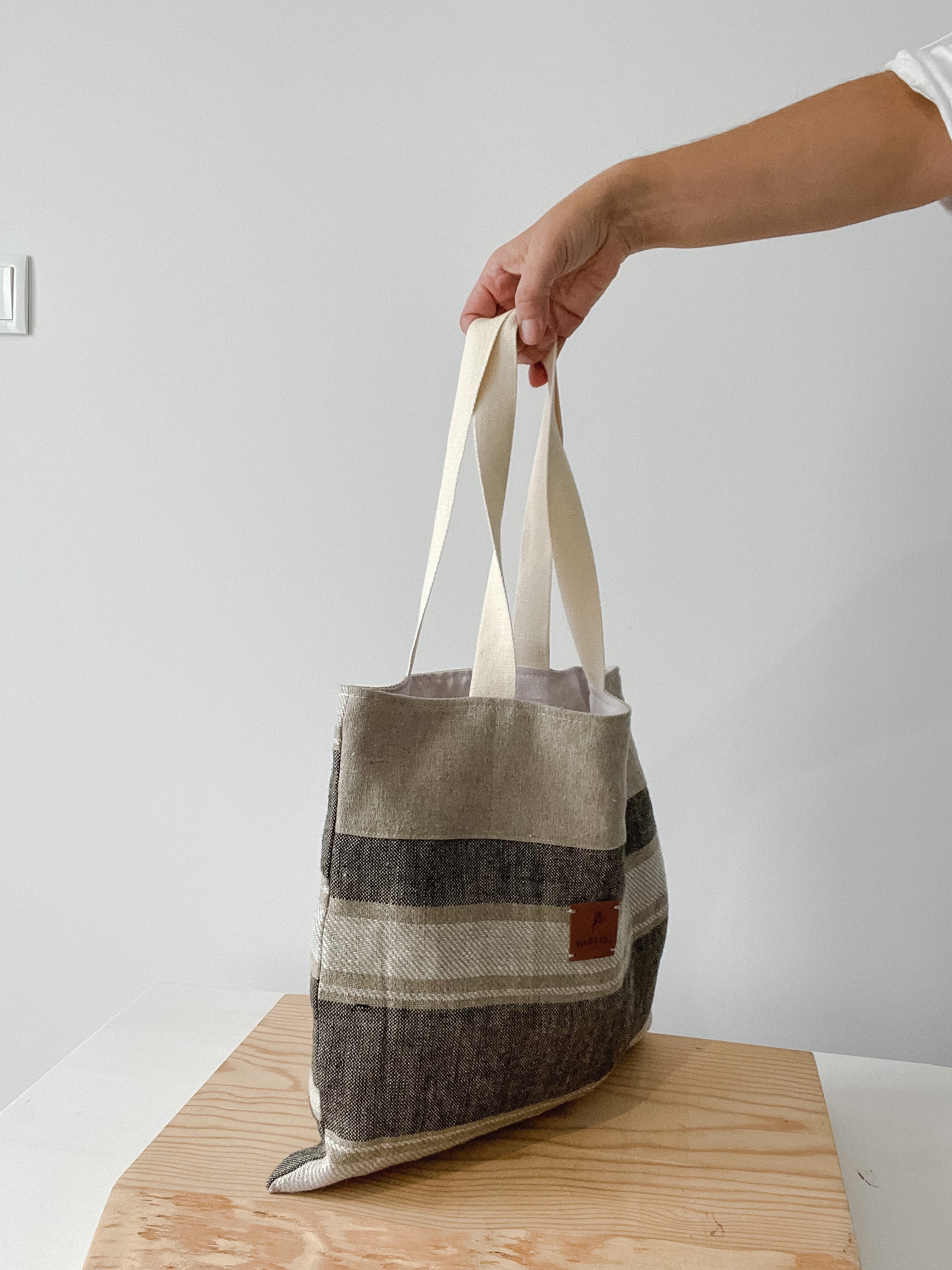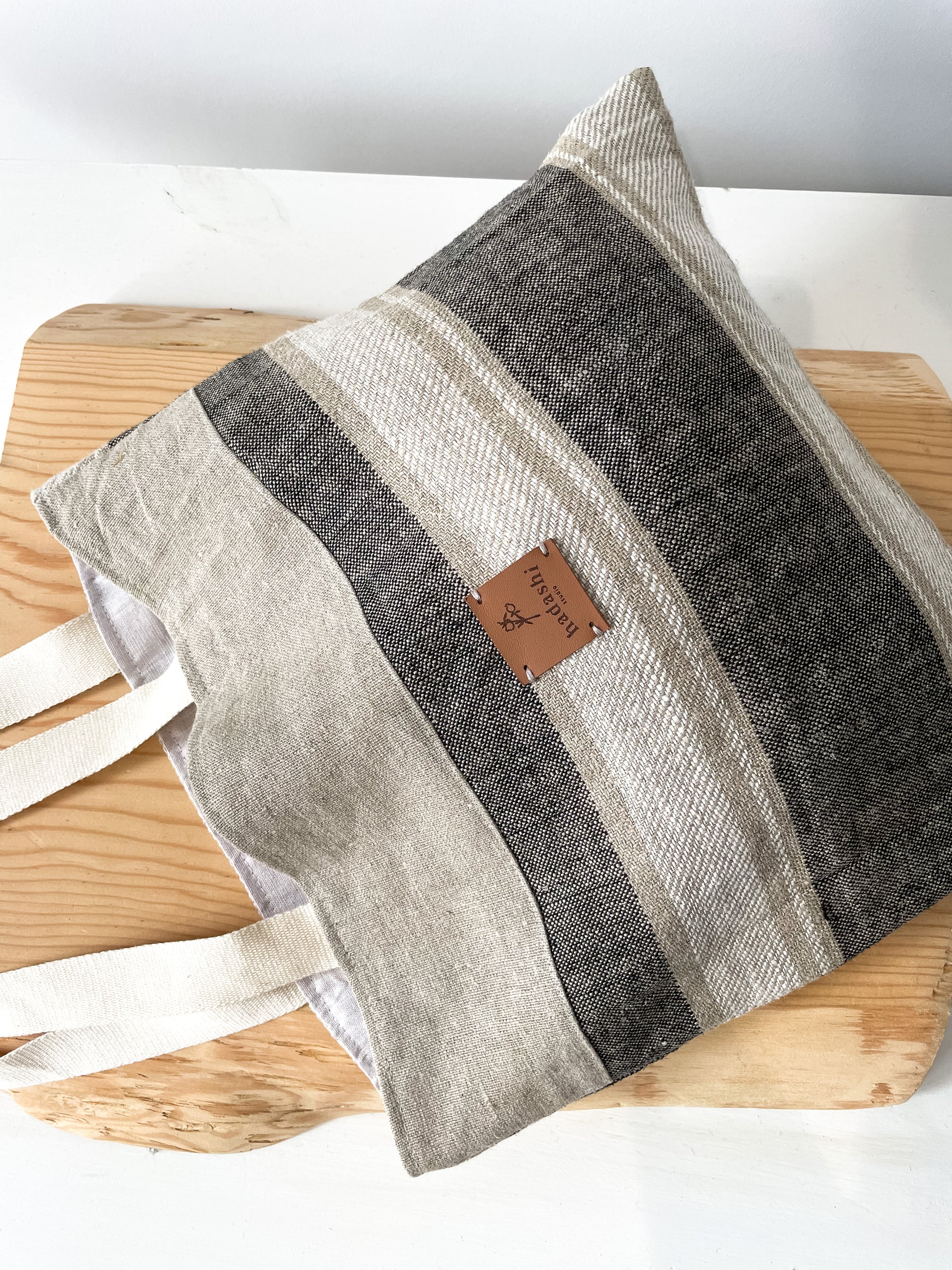 This bag is made of 100% linen in the interior and exterior, so it will age beautifully. The large striped pattern (brown and beige) will go with most of the pieces in your wardrobe. Although casual, it´s super elegant.