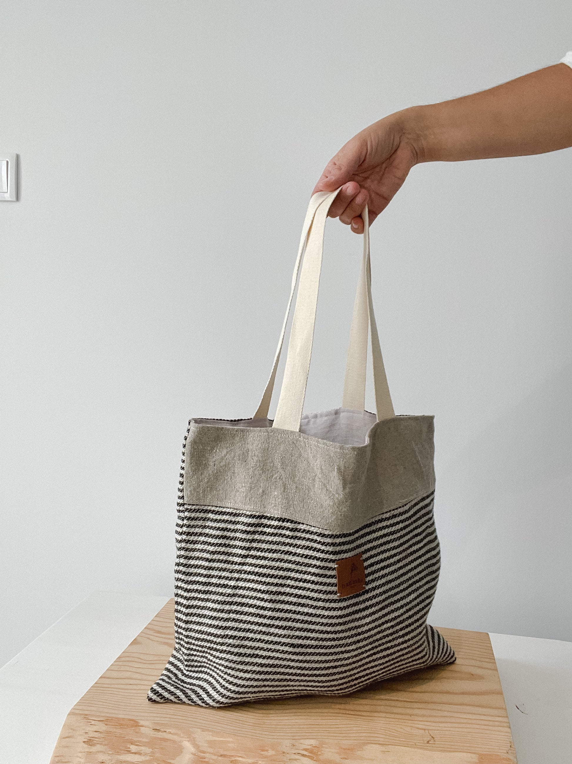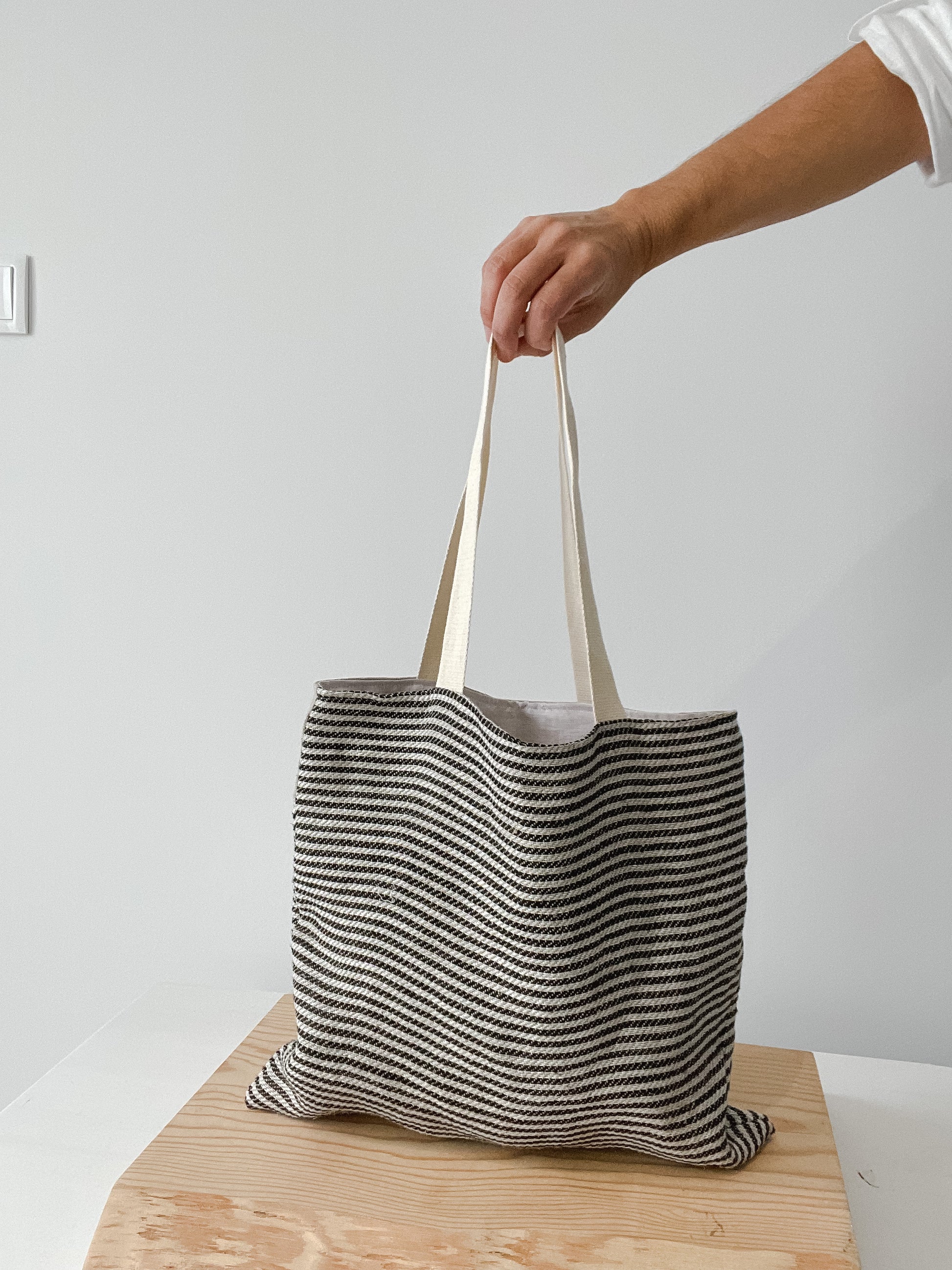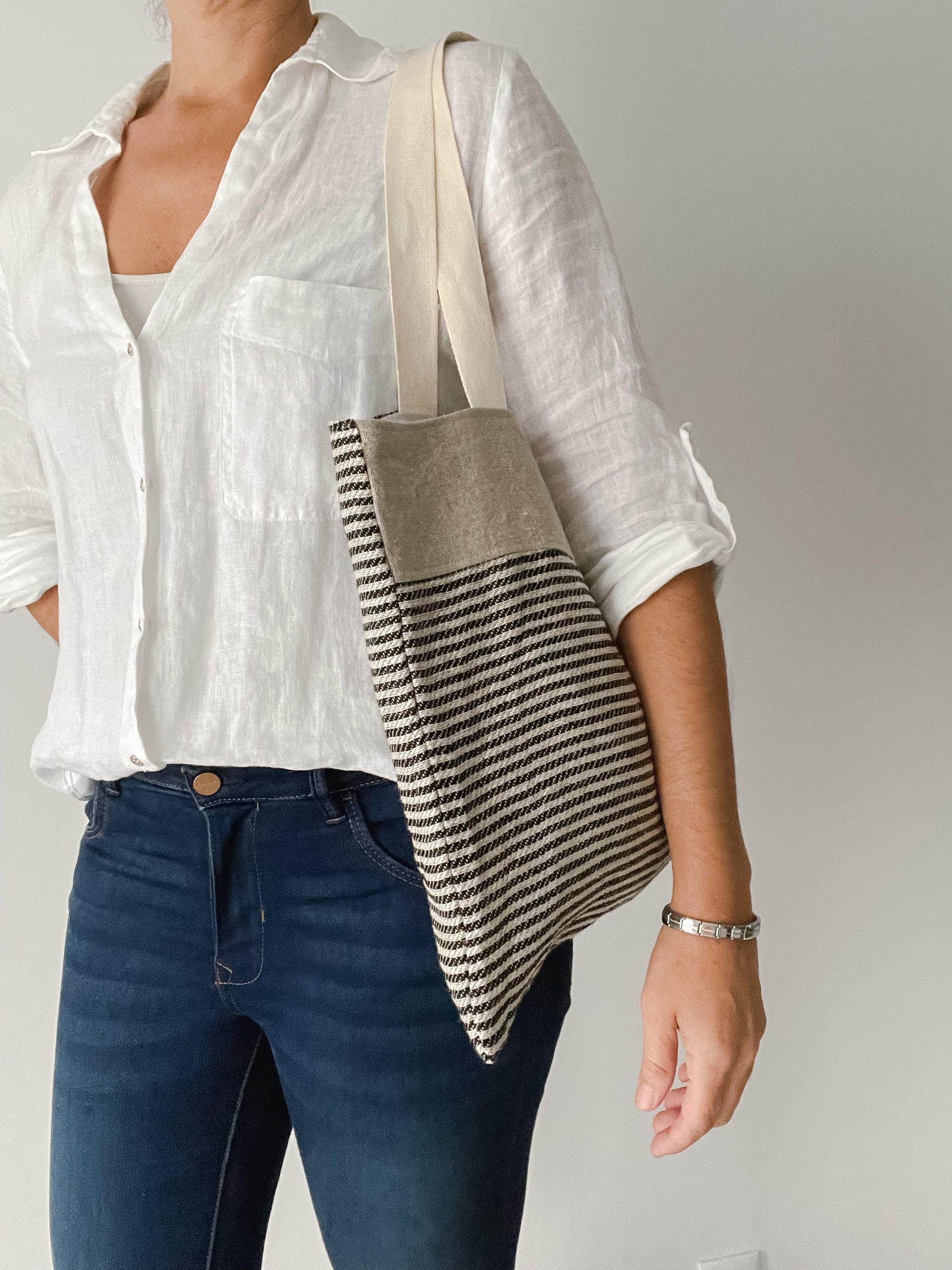 This bag is made of 100% linen in the interior and exterior, so it will age beautifully. The thin striped pattern (black and white) will go with most of the pieces in your wardrobe. Although casual, it´s super elegant.
