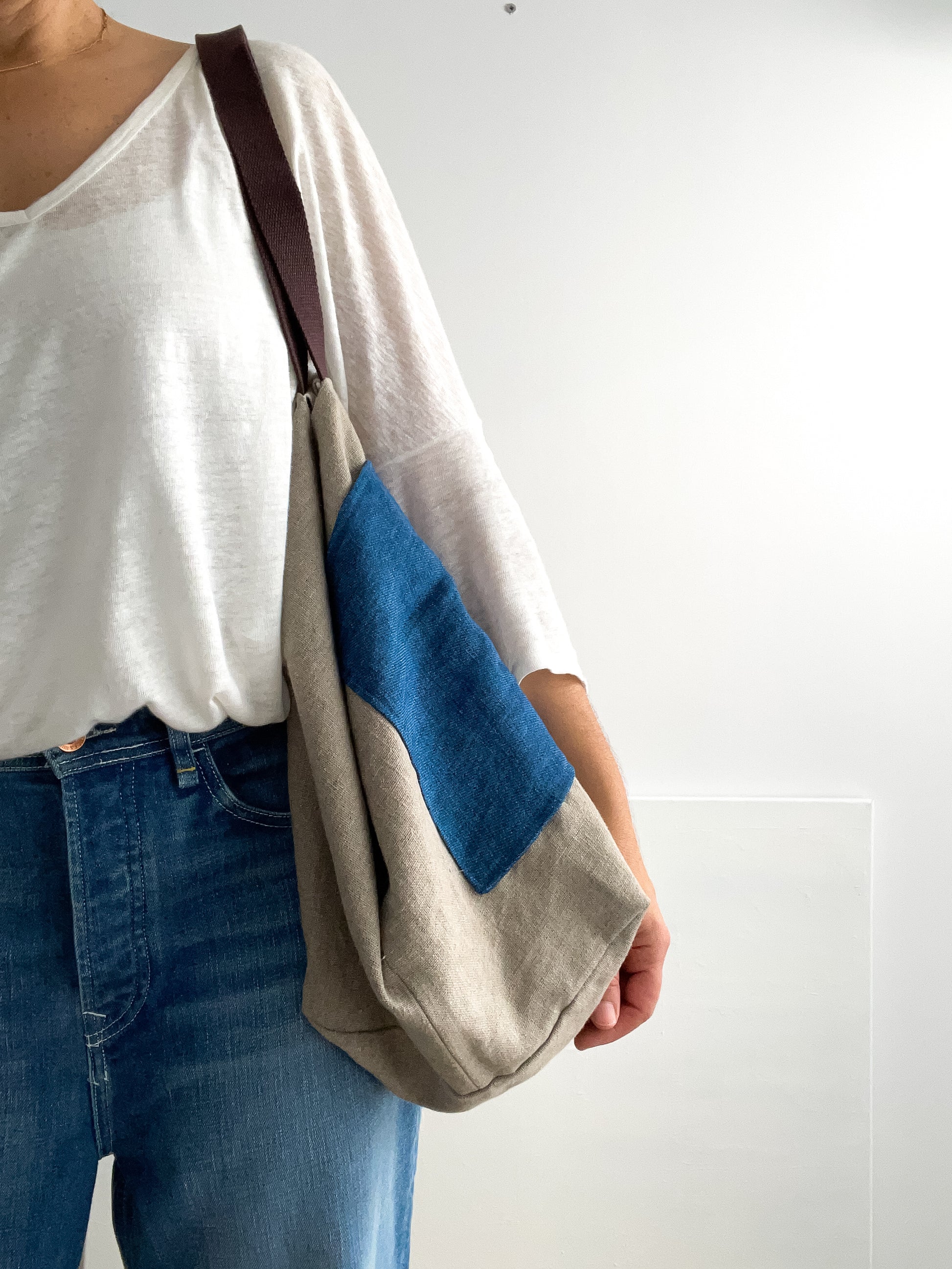This bag has 100% indigo dyed linen details in the exterior pocket, and a brown shoulder strap.