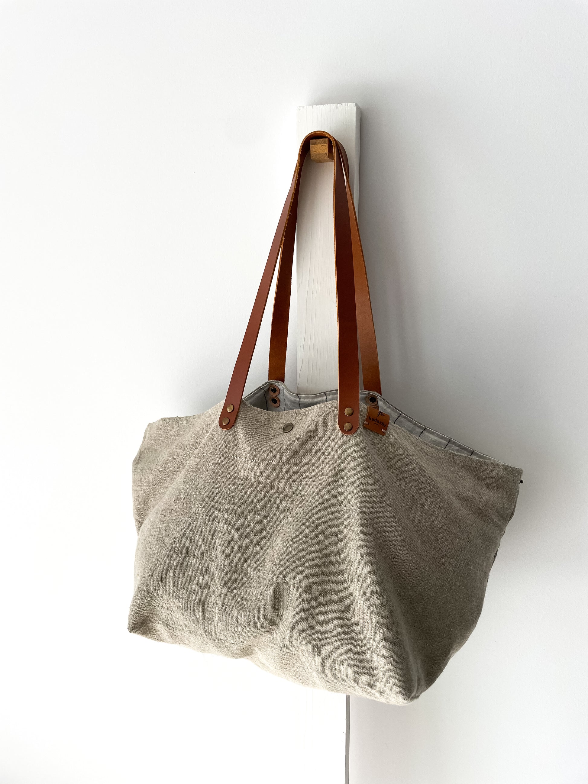 One set of comfortable leather handles so you can carry it in your hand or on your shoulder, with a big pocket inside. Two snaps system for closure so you don´t loose anything.